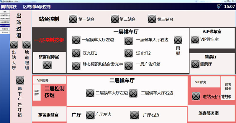 區(qū)域群體控制或場景控制界面見圖,用于對整個站內照明進行群體控制和預設的場景控制?梢愿鶕枨箢A設多種控制場景,可以單次點擊控制一整個區(qū)域或者整個站臺的照明。