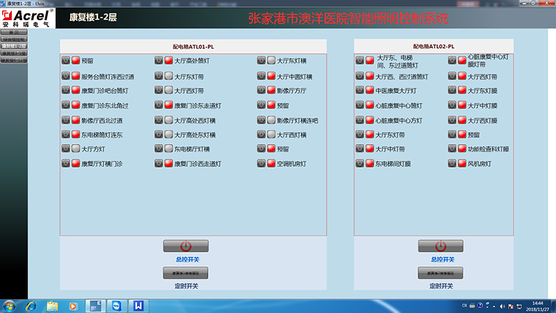 安科瑞智能照明監控系統主要實現張家港澳洋醫院的樓層公共區域的照明回路的遠程控制。該系統總計有51臺ASL100-S4/16,24臺ASL100-S8/16,現場所有智能照明控制模塊采用混合串并聯的方式接在一起,采用KNX總線通訊,從而完成整個醫院的智能照明控制網絡,實現值班室總機的通訊,同時護士站設立區域分控觸摸屏,完成后臺和分控的數據連接。 ??