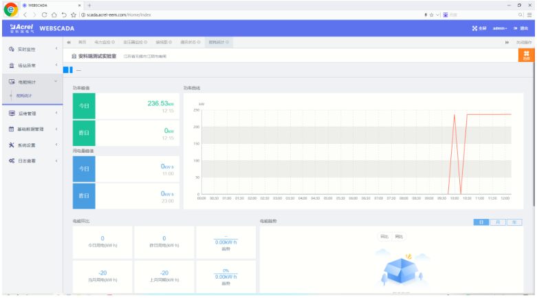 能耗統計頁面顯示各回路的功率峰值和用電量峰值,功率、電能趨勢曲線,電能環比, 用電排名。