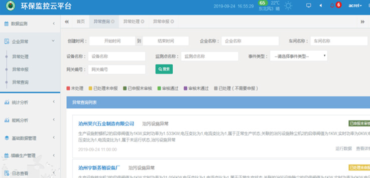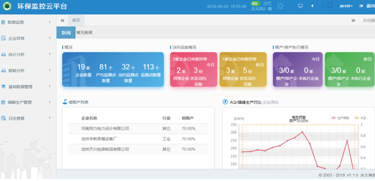 通過關(guān)聯(lián)分析、超限分析、啟停時間分析,及時發(fā)現(xiàn)環(huán)保治理設(shè)備未開啟、異常關(guān)閉及減速、空轉(zhuǎn)、降頻等異常情況,同時通過數(shù)據(jù)分析還可以實(shí)時監(jiān)控限產(chǎn)和停產(chǎn)整治企業(yè)運(yùn)行狀態(tài),如圖所示: