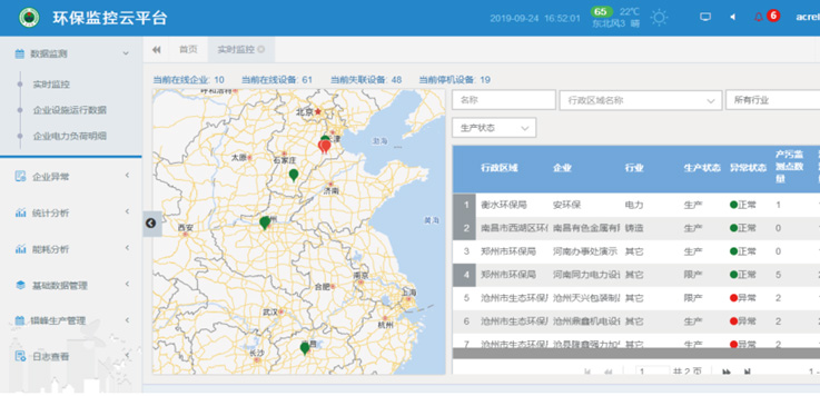設(shè)備狀態(tài)分析:統(tǒng)計分企業(yè)某個時間段內(nèi)的產(chǎn)污設(shè)備運(yùn)行、停機(jī),監(jiān)測設(shè)備失聯(lián),可以查看實(shí)時上報的數(shù)值。